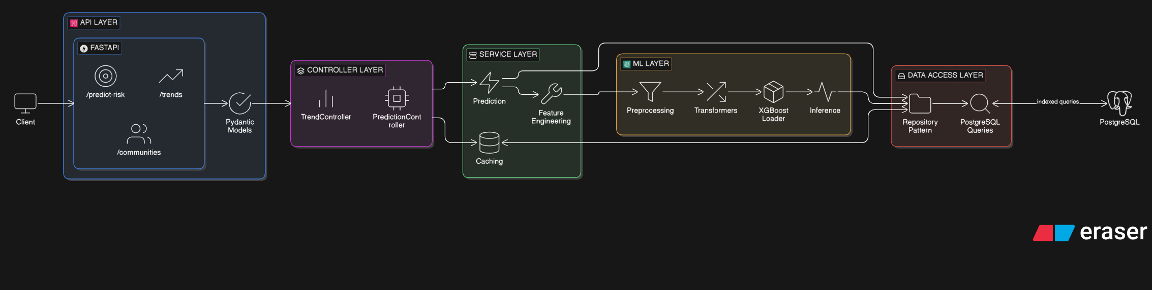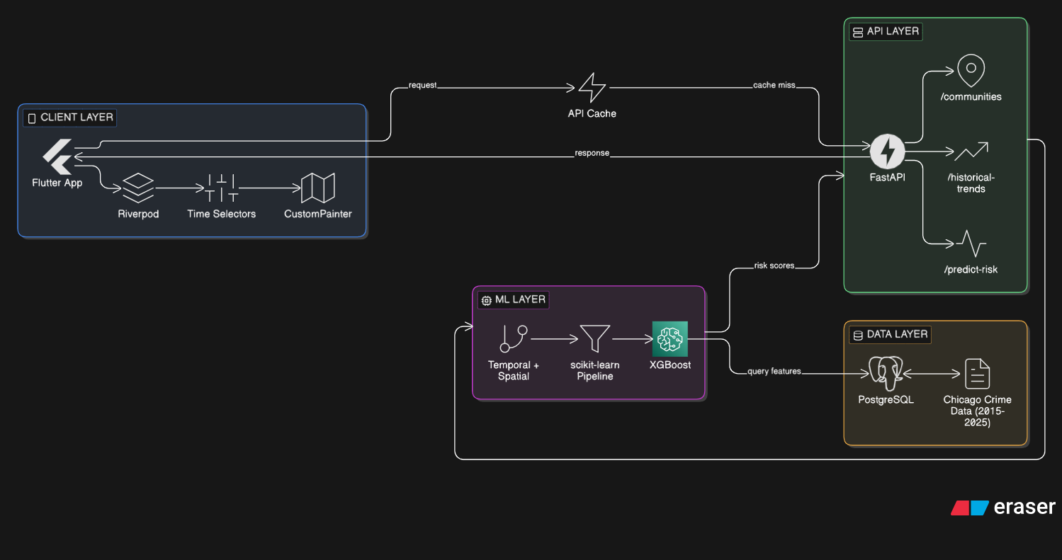 ML-powered predictive crime safety platform visualizing temporal risk across urban communities.